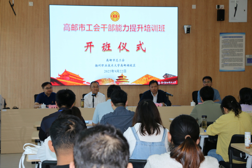 9月22日上午,高邮市工会干部能力提升培训班在我校高邮湖校区顺利开班。本次培训为期5天,由高邮市总工会主办、我校师范学院承办,来自高邮市总工会、团市委、市妇联及各基层工会等40名工会干部齐聚一堂,开启“充电赋能”之旅。校党委副书记陈亚鸿,高邮市委常委、组织部部长、城南经济新区党工委书记杨洋,师范学院院长厉爱民,高邮市总工会党组书记、主席倪荣平等领导参加开班仪式。开班仪式由倪荣平主持。