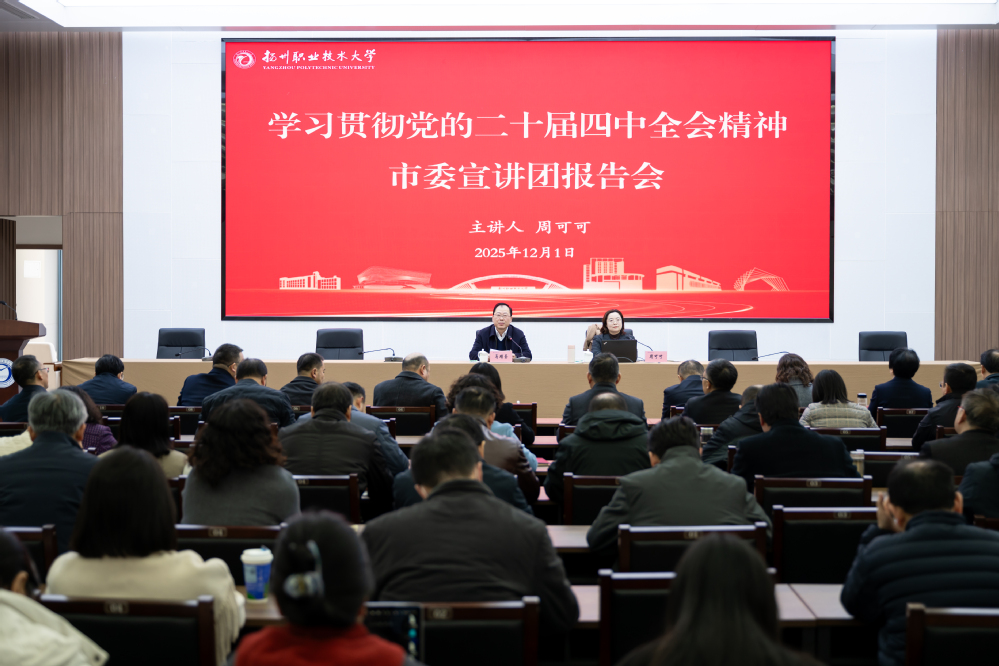 12月1日,学习贯彻党的二十届四中全会精神市委宣讲团报告会在我校举行。校党委书记马顺圣主持报告会。市委宣讲团成员,扬州工业职业技术学院党委委员、宣传部部长、马克思主义学院党总支书记周可可副研究员作宣讲报告。