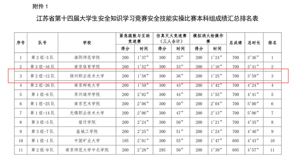 由江苏省教育厅主办,江苏省高教学会保卫研究会承办的江苏省第十四届大学生安全知识学习竞赛安全技能实操比赛于12月6—7日在南京工业大学成功举行。扬州职业技术大学代表队历经多轮激烈角逐,最终从全省众多参赛高校中脱颖而出,以满分成绩荣获本科组第三名,为学校赢得了荣誉。