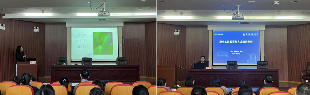 学校发展规划处副处长张翔以《职业本科教育与人才培养定位》为题开展第二场讲座。他结合产业升级趋势与国家政策演进,深入解读职业本科“高端技能人才”培养定位,聚焦旅游管理、大数据工程技术等专业标准,提出课程体系需对接高端产业与产业高端需求,通过“做学合一”模式强化学生复杂问题解决能力与技术创新思维,为两院课程体系优化、人才培养模式创新提供了理论支撑与实践路径。