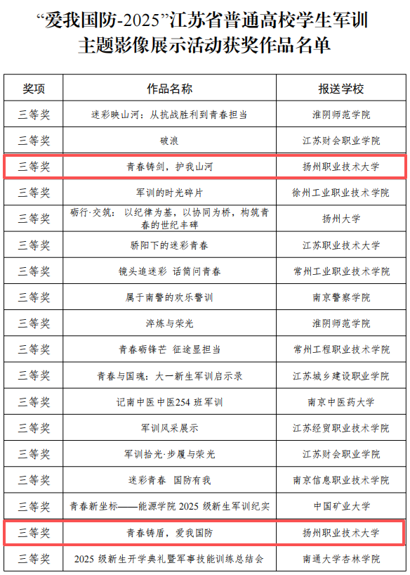 近日,“爱我国防-2025”江苏省普通高校学生军训主题影像展示活动评选结果正式揭晓,我校选送的《青春铸剑,护我山河》《青春铸盾,爱我国防》两部作品凭借鲜明的主题立意、生动的内容呈现,双双荣获全省三等奖,充分展现了我校学子浓厚的国防情怀与昂扬的青春风貌。