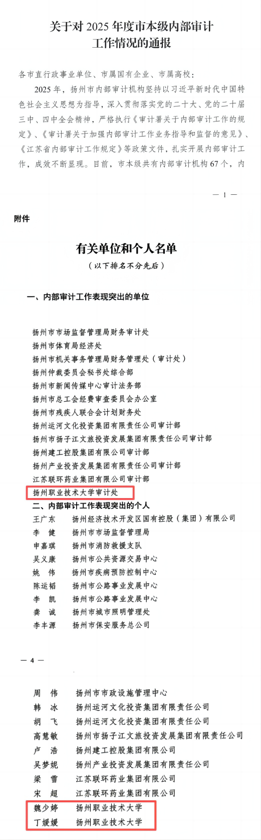 近日,我校审计工作荣获扬州市“内部审计工作表现突出的单位”称号,2位工作人员获评“内部审计工作表现突出的个人”。至此,审计处已连续三年荣获市级内部审计先进表彰,彰显了学校内部审计工作高质量发展的扎实成效与持续向好的发展态势。