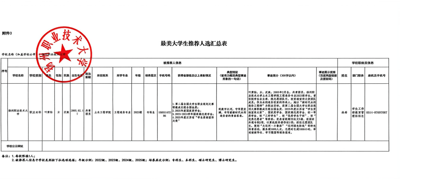 根据《教育部办公厅关于开展“最美高校辅导员”“最美大学生”推选展示活动的通知》(教思政厅函〔2026〕2号、《省教育厅办公室关于转发教育部办公厅开展“最美高校辅导员”和“最美大学生”推选展示活动的通知》文件精神,经学生自主申报、学院审核推荐、校内外专家评审,最终拟推荐土木工程学院叶紫怡同学参与江苏省2026年“最美大学生”推选展示活动,现将名单予以公示。