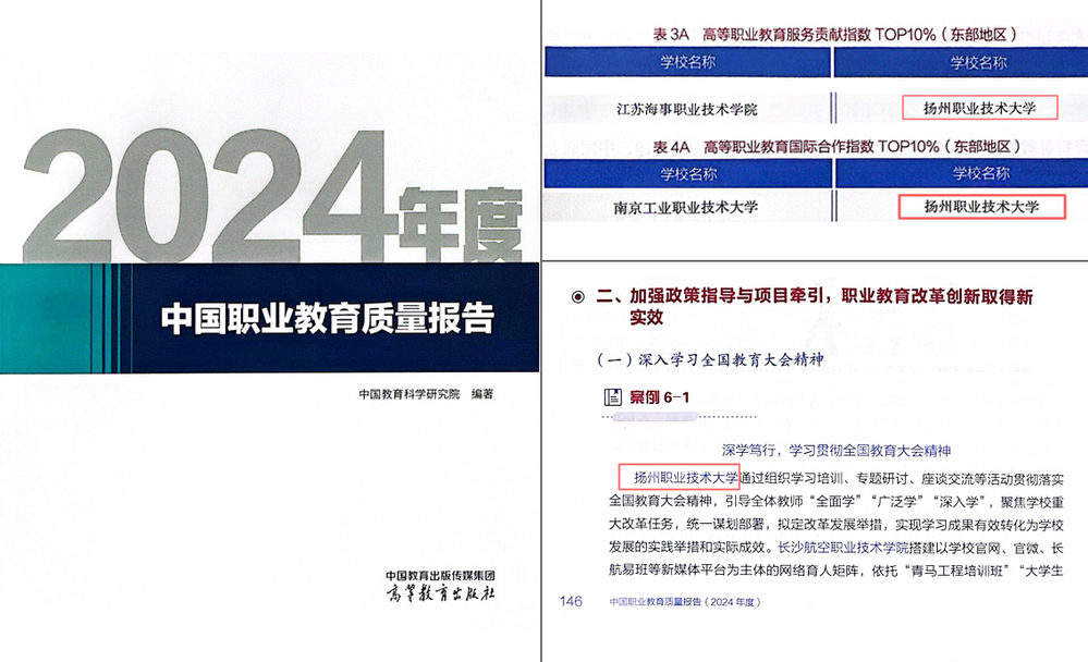 近日,中国教育科学研究院发布《2024年度中国职业教育质量报告》,我校入选“深学笃行,学习贯彻全国教育大会精神”典型案例,同时蝉联“服务贡献”“国际合作”指数TOP10%学校(东部地区),展示了我校深入开展学习贯彻全国教育大会精神创新举措与显著成效,体现我校服务贡献力、国际影响力和综合竞争力。