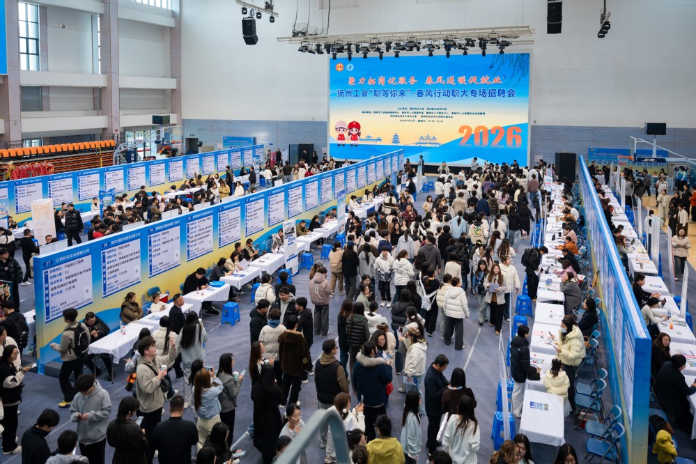 为全面落实毕业生就业工作部署,3月22日下午,由扬州市总工会与我校联合举办的“聚力拓岗优服务 春风送暖促就业”高校毕业生专场大型招聘会在学校体育馆举行。扬州市总工会党组书记、副主席蒋元峰,学校党委书记马顺圣,扬州市总工会党组成员、副主席孙凌雷,学校党委副书记陈亚鸿等领导出席活动,现场详细了解并回应用人单位及求职学生的具体需求。