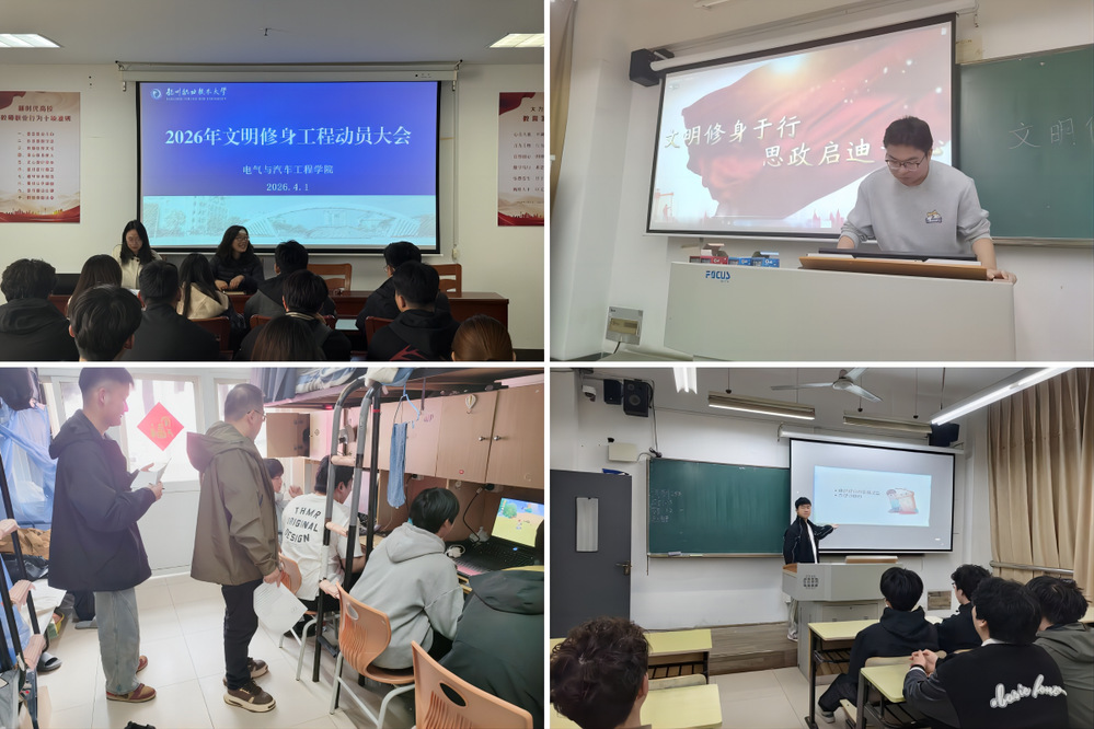 【电汽学院】电气与汽车工程学院以 “文明修身・劳动最美・安全同行” 为主题开展系列活动。学院召开动员大会,对多栋学生宿舍进行安全卫生专项排查,整治内务与安全隐患;各班级召开主题班会,组织学习倡议书并集体签名承诺,晚自习重温行为规范,强化学生规则意识与文明素养。(季彩宏)