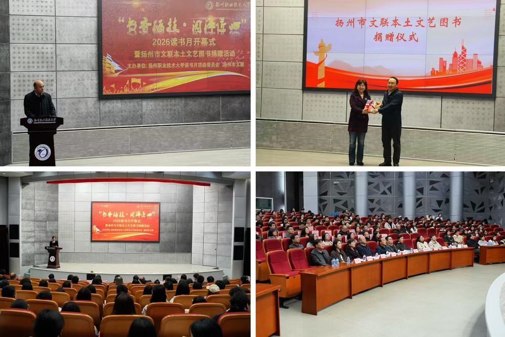 4月22日下午,学校2026年“书香砺技·阅淬匠心”读书月活动开幕式暨扬州市文联本土文艺图书捐赠活动在映月湖报告厅举行。扬州市文联党组书记、主席黄振宇,市教育局党委委员、副局长赵宇,市文联党组成员、副主席朱红梅,校党委委员、副校长吴书安,党委委员、纪委书记曹妍,扬州大学、江苏旅游职业学院、梅岭中学相关领导出席开幕式,学校相关职能部门负责人、学院师生代表300余人参加活动。活动由图书馆馆长张艳主持。