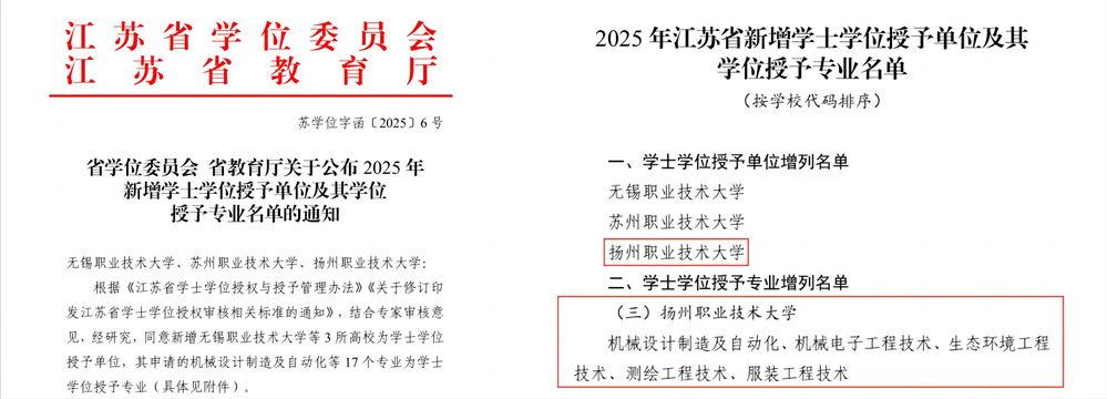 近日,江苏省学位委员会、江苏省教育厅联合发布通知,正式批准学校成为新增的学士学位授予单位。首批拟授予学士学位的本科专业为机械设计制造及自动化、机械电子工程技术、生态环境工程技术、测绘工程技术、服装工程技术五个专业,均通过审核并获准增列为学士学位授予专业。这一重要举措标志着学校正式具备学士学位授予资格,办学层次与人才培养质量实现新突破。