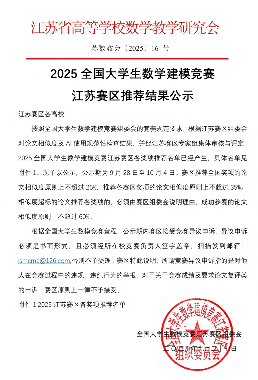 近日,2025年“高教社杯”全国大学生数学建模竞赛江苏赛区成绩揭晓,由数学科学学院郭永燕博士和姜道旭老师指导的学生团队分获江苏省专科组一等奖和三等奖。