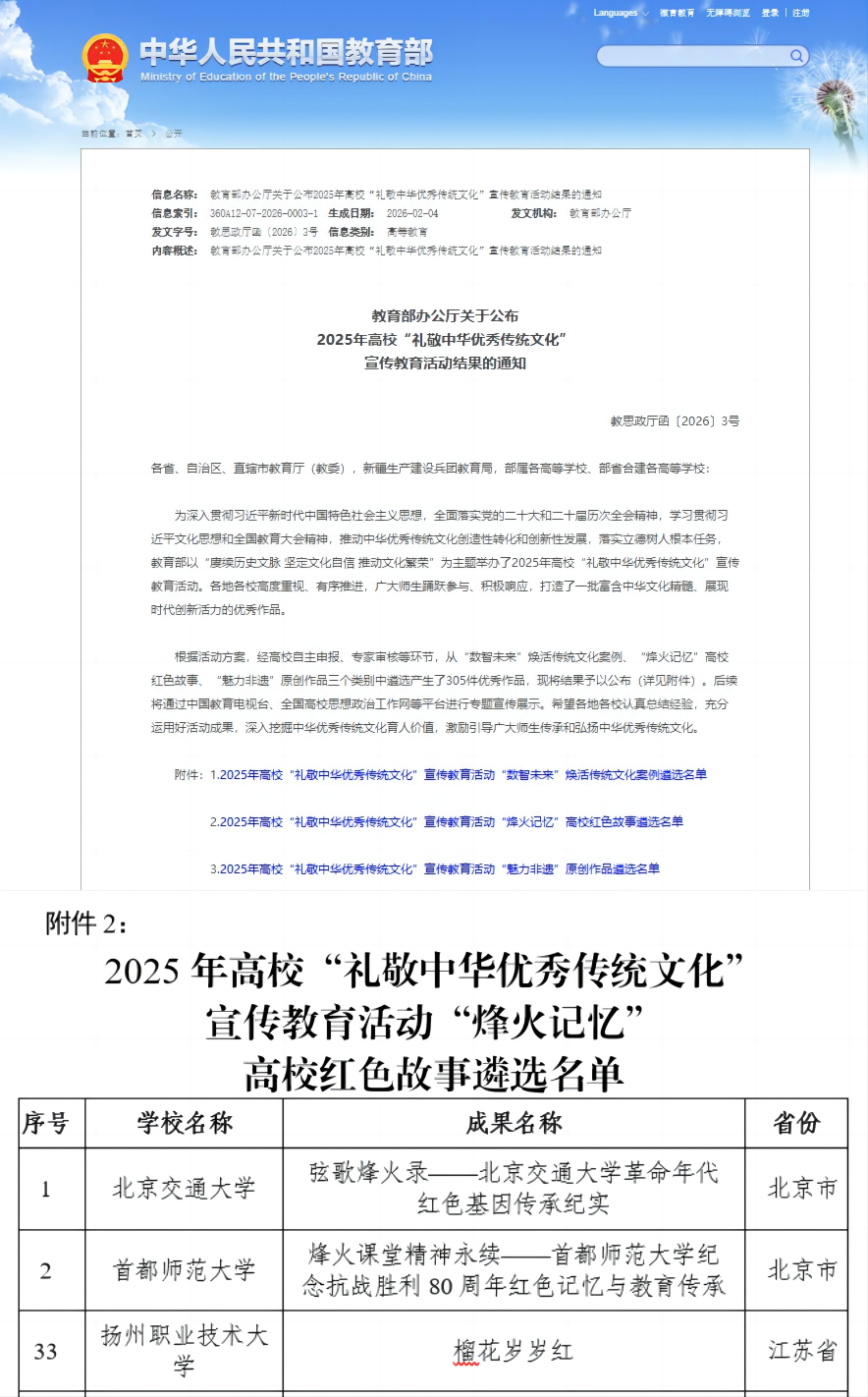 近日,教育部思想政治工作司公布2025年高校“礼敬中华优秀传统文化”宣传教育活动遴选结果,学校报送的作品《榴花岁岁红》经自主申报、高校审核推荐及两轮专家评审,入选“烽火记忆”高校红色故事优秀成果名单。据悉,今年全国共有100件作品入选,其中包含江苏高校11所。